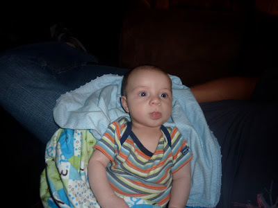 Looking at his daddy! He is such a daddy's boy, he can't stop kicking his feet and squealing whenever Mitch comes home from work! And he's got his daddy's blue eyes and dimples!